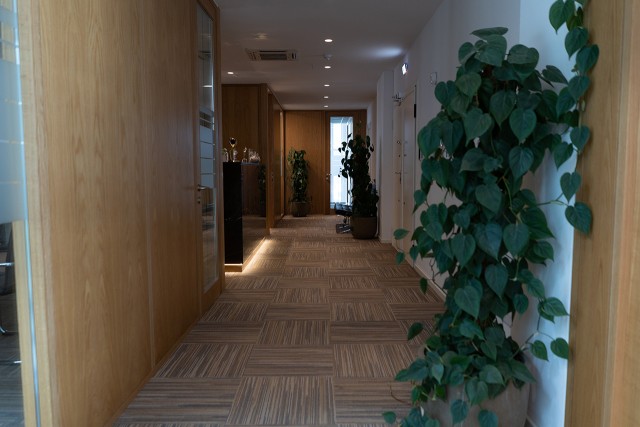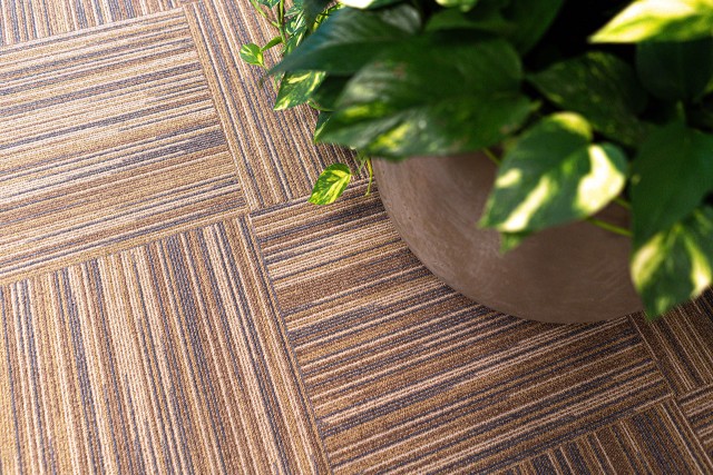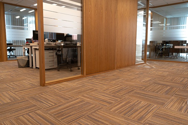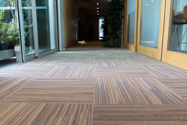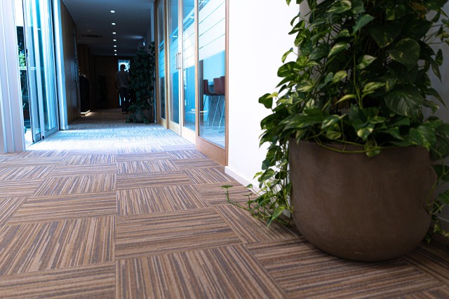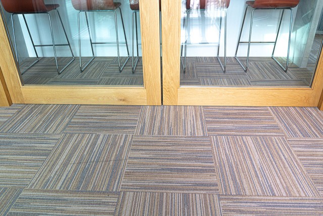 Supply and installation of loop piled carpet tiles in the office area, fitted in an eye-catching cross-check pattern.